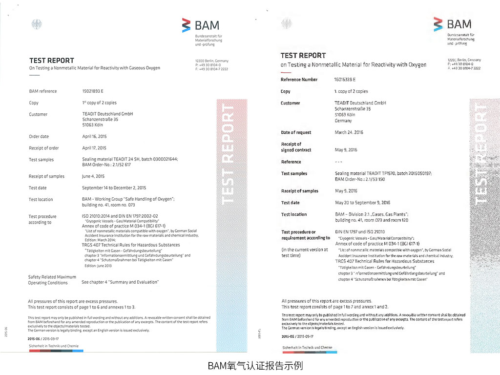 SealTex索拓合作品牌TEADIT泰迪如下型號具有BAM氧氣認(rèn)證測試報告: